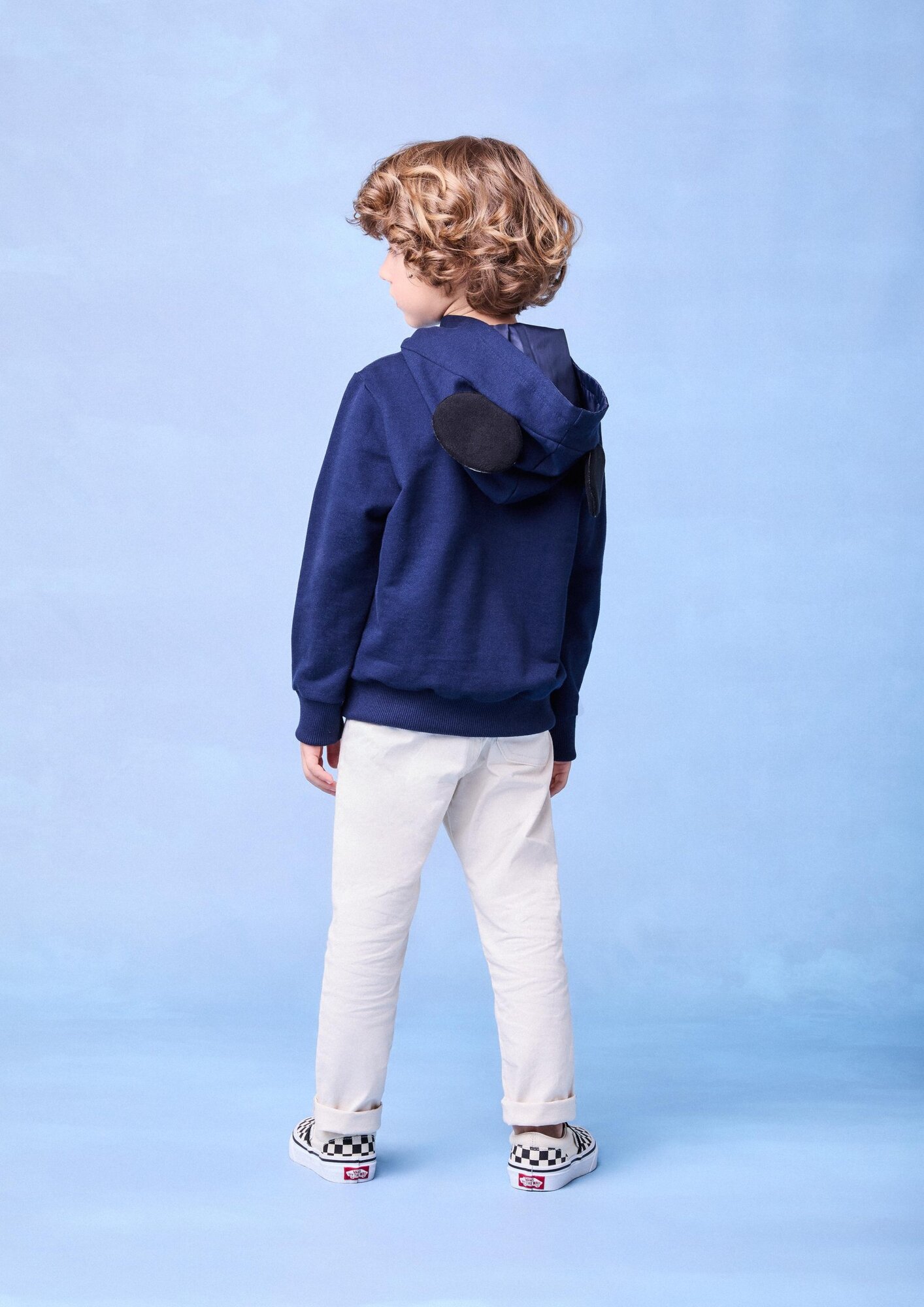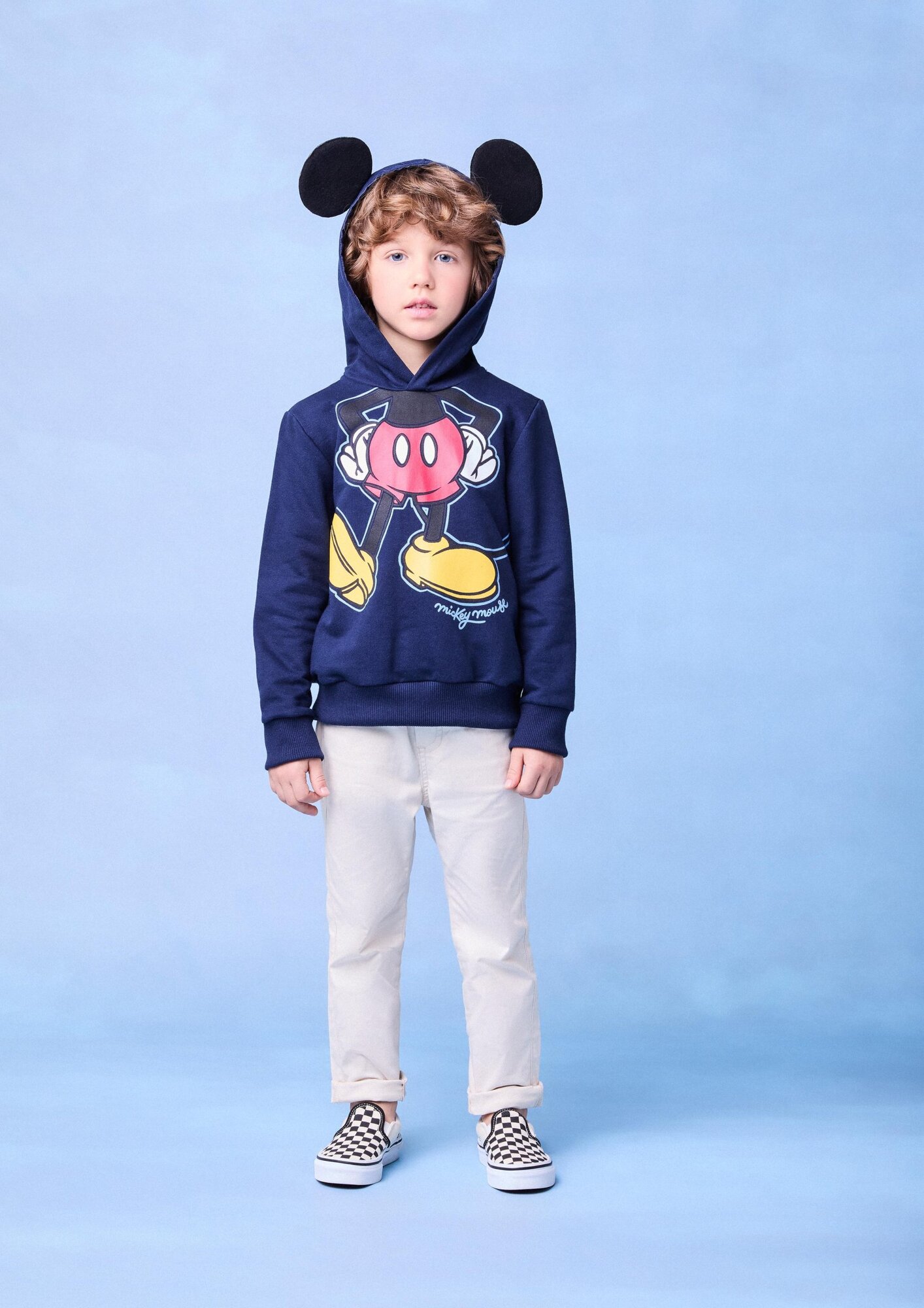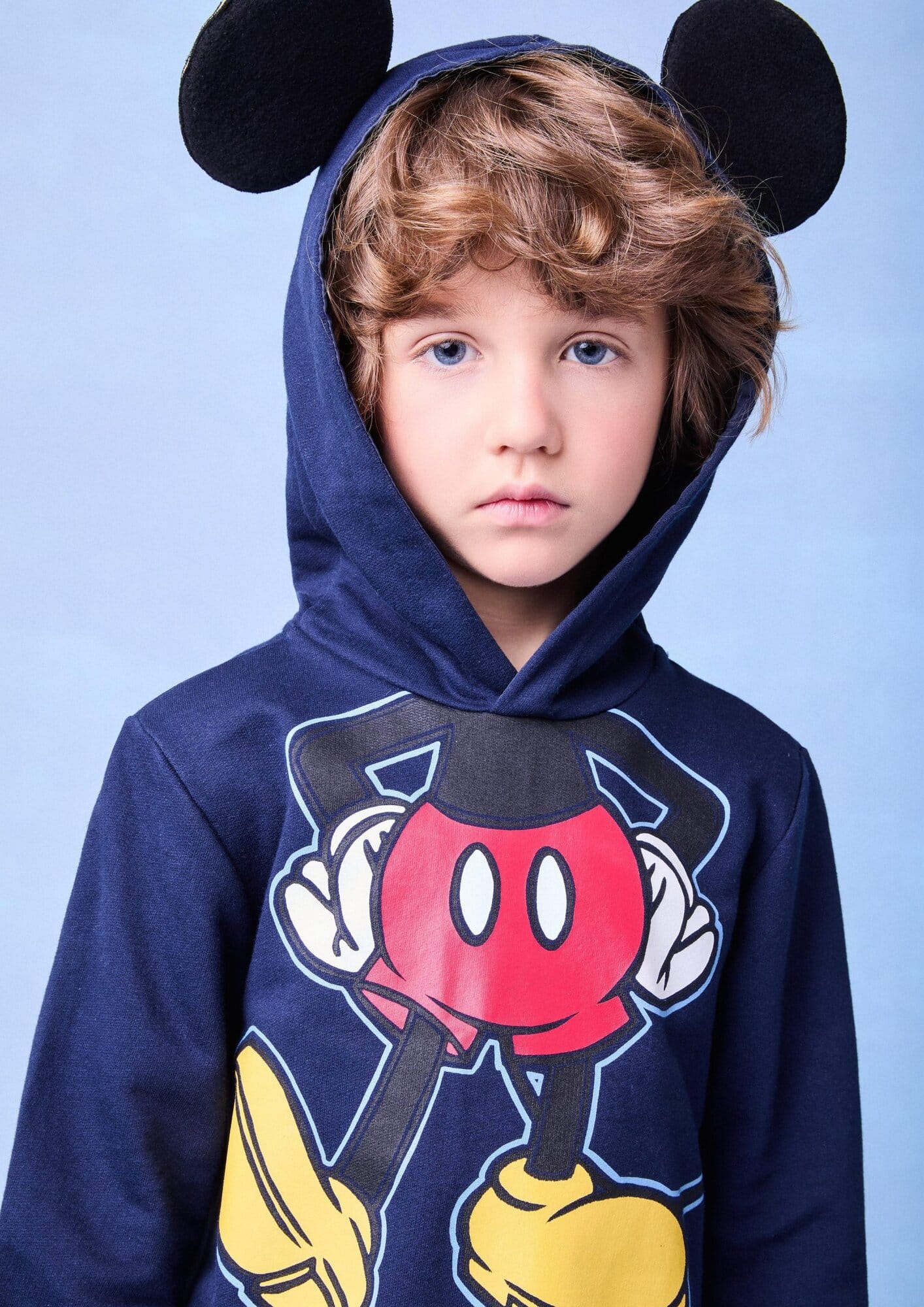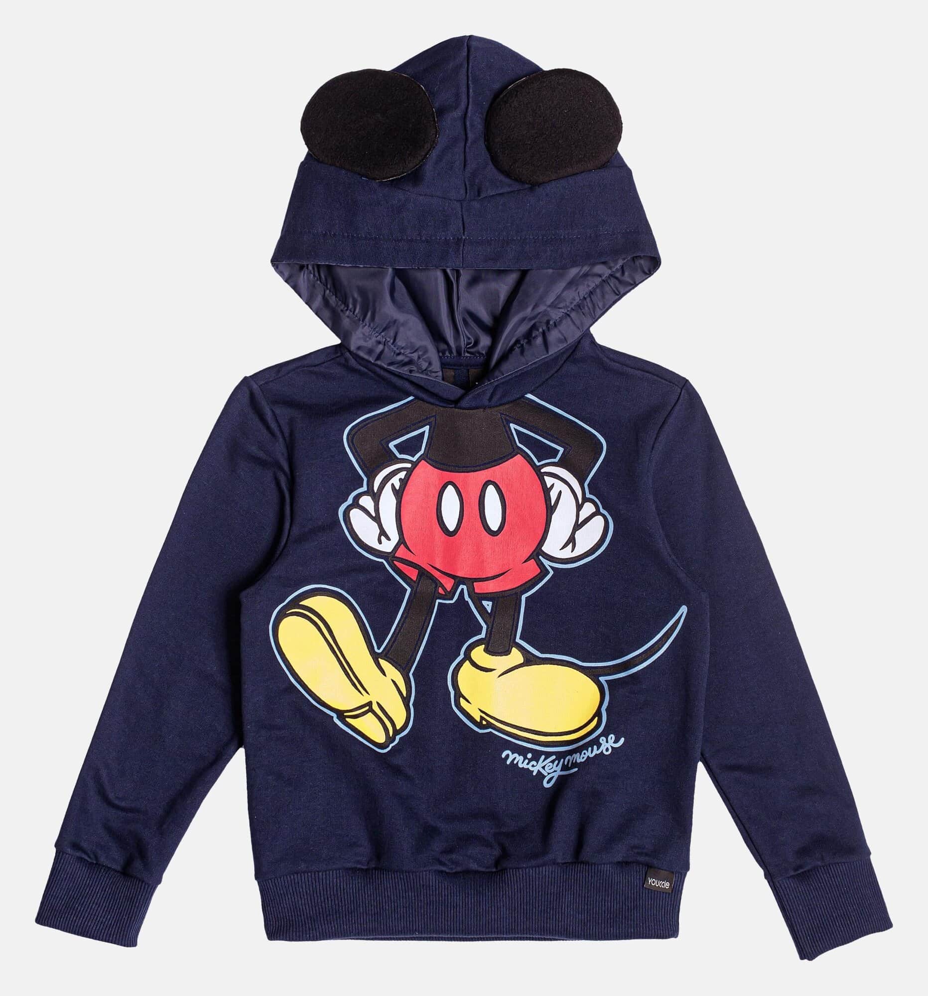 Uma peça irresistível para os pequenos fãs do Mickey! Este moletom azul marinho apresenta o icônico personagem com detalhes vibrantes na frente. O capuz divertido com orelhas acolchoadas traz um toque lúdico, perfeito para um look descontraído e cheio de estilo. Ideal para os dias mais frios, com ribanas nos punhos e barra para um ajuste confortável. Ref.: I1941