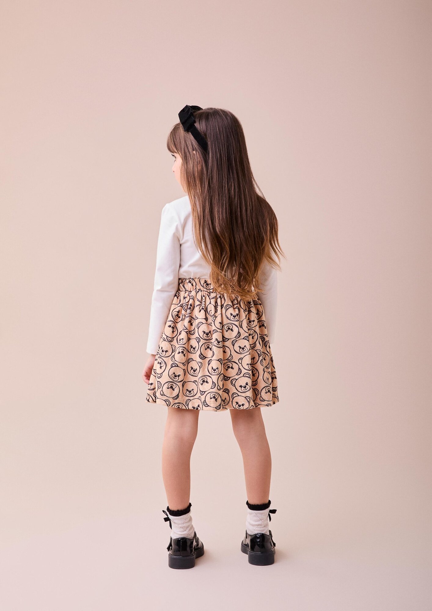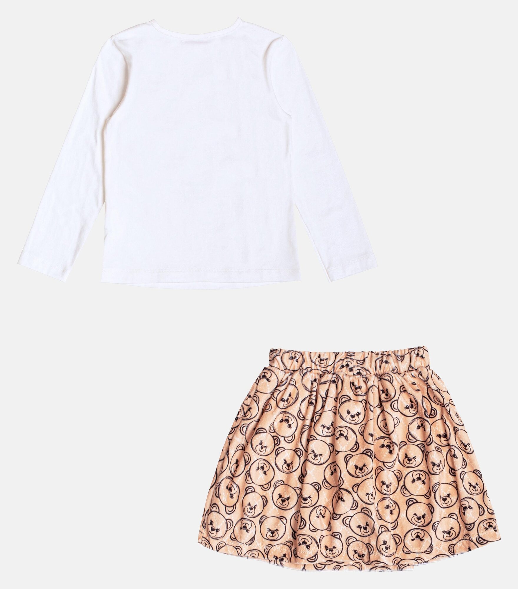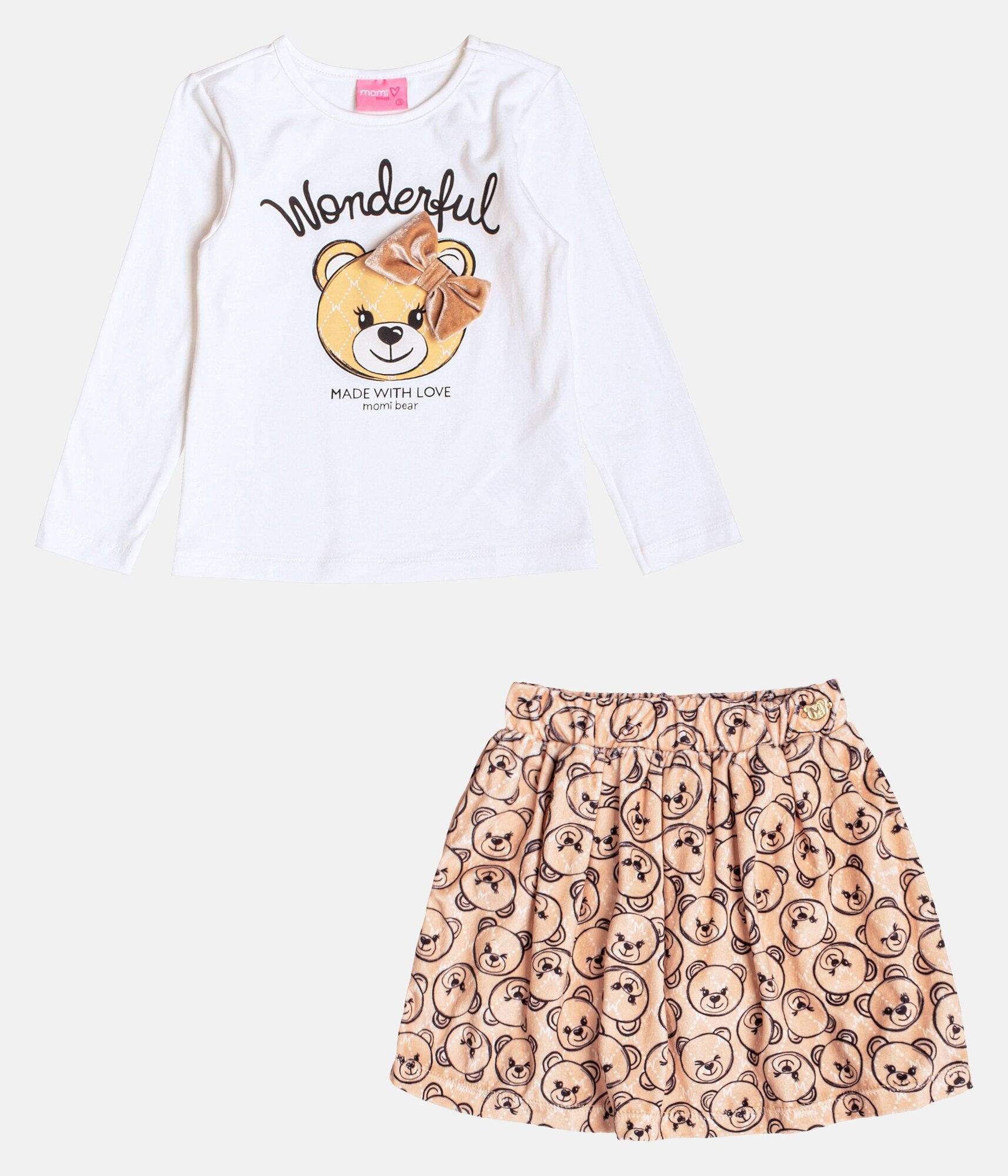 Este para meninas que amam um look cheio de personalidade, esse conjunto é a escolha perfeita! A blusa branca com aplicação de laço dourado destaca-se pelo design delicado, e a saia bege com estampa de ursinhos traz leveza e diversão ao visual. Ideal para encontros e passeios. Ref.: J6516