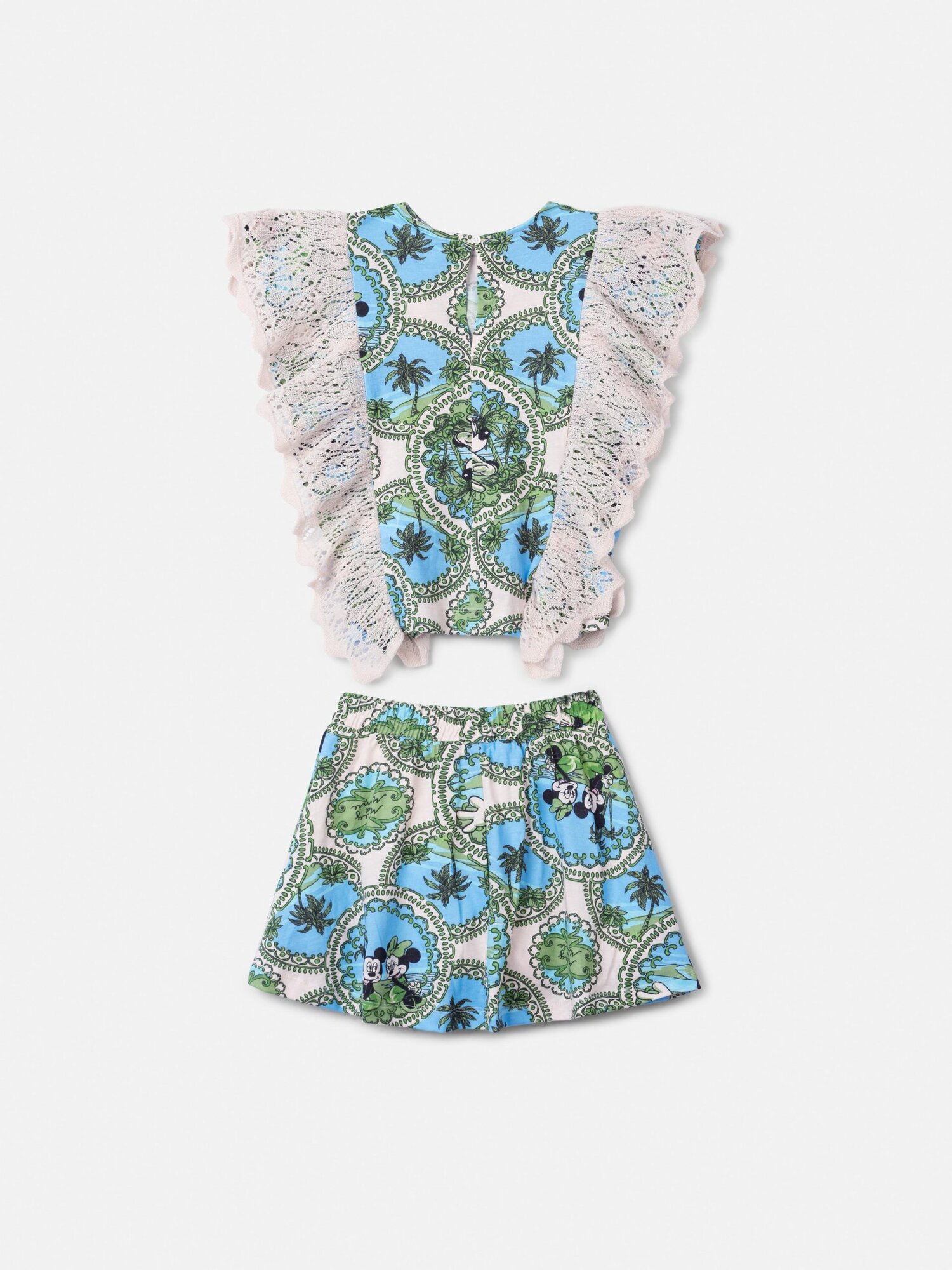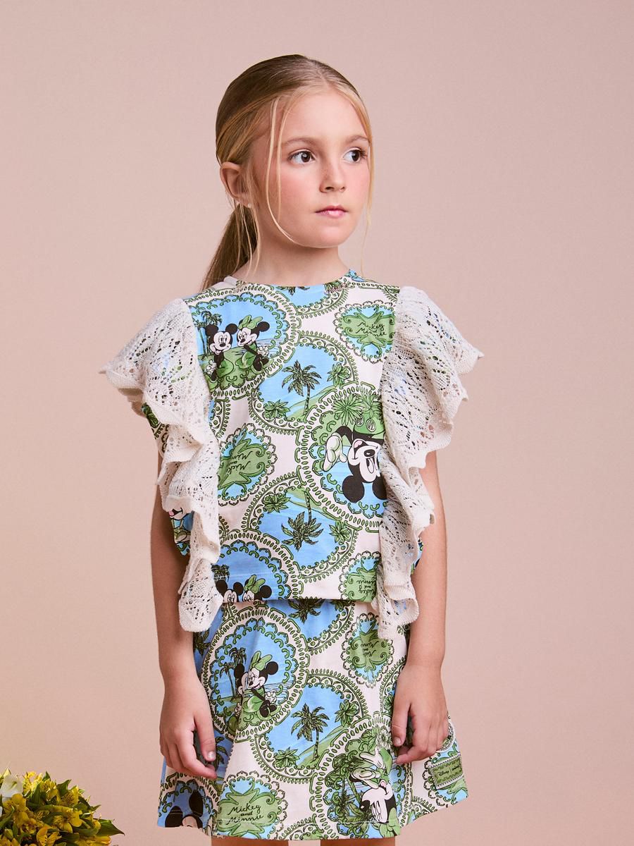 Com estampa de mandalas inspiradas no universo Disney, esse conjunto se destaca pelos babados de tricot que adornam a blusa. A proposta é sofisticada, com um toque artesanal e muito conforto para as pequenas. Ref.: N5183