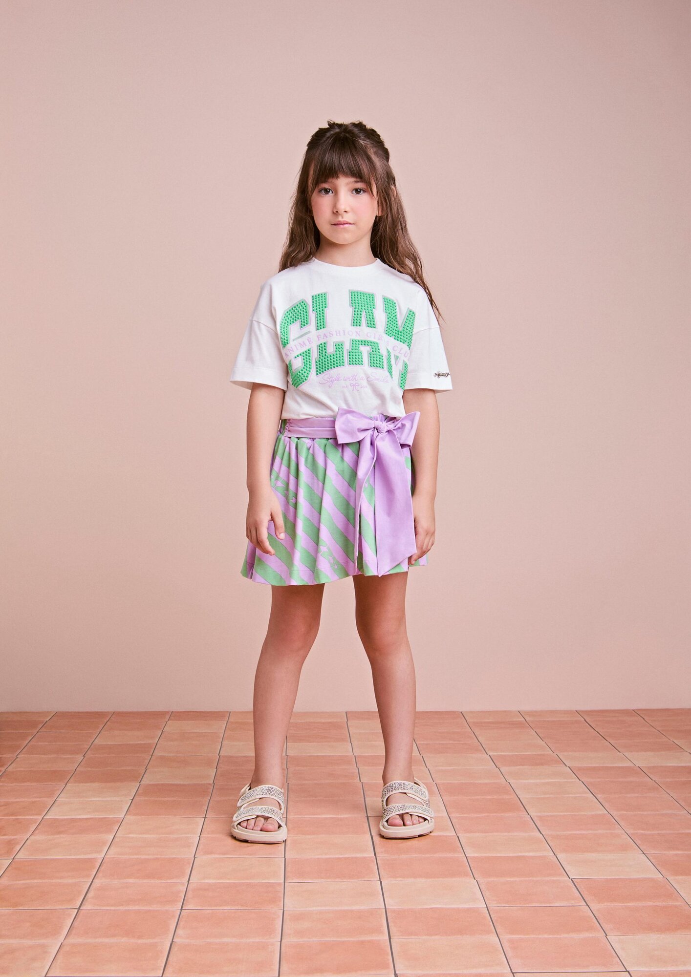 Inspirado no estilo glam, esse conjunto aposta nas listras com brilho e no toque fashion do maxi laço centralizado na blusa. A saia em tule com sobreposição garante movimento e delicadeza. Um look digno de fashionistas mirins. Ref.: N5254