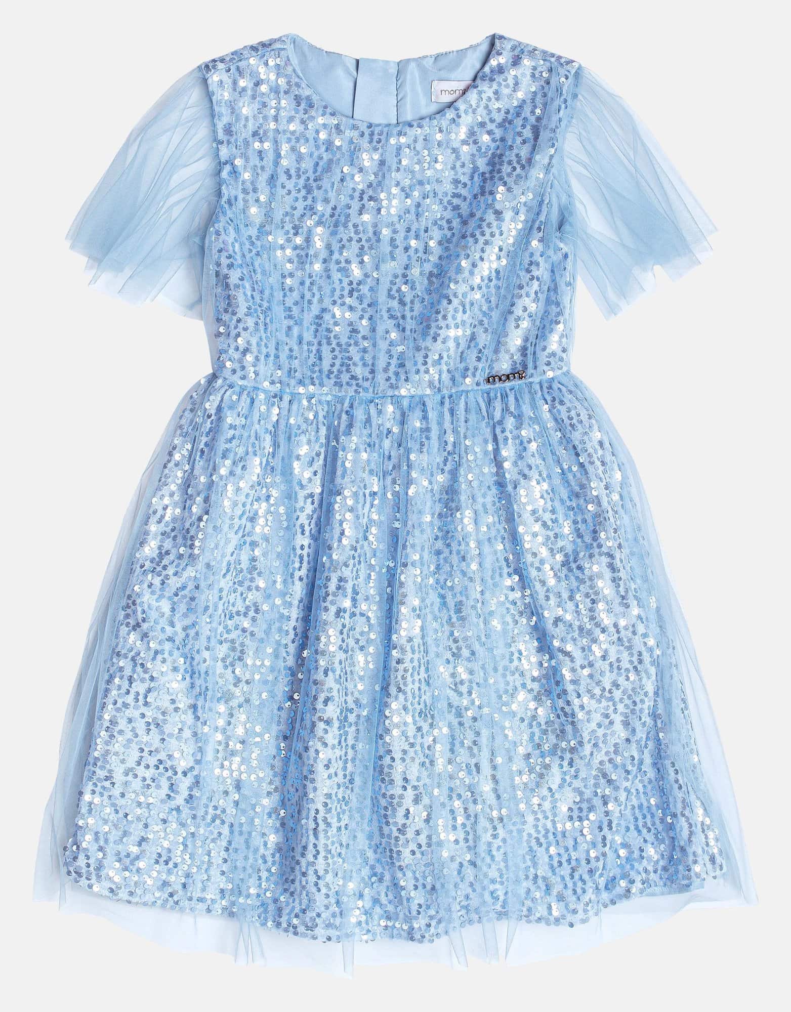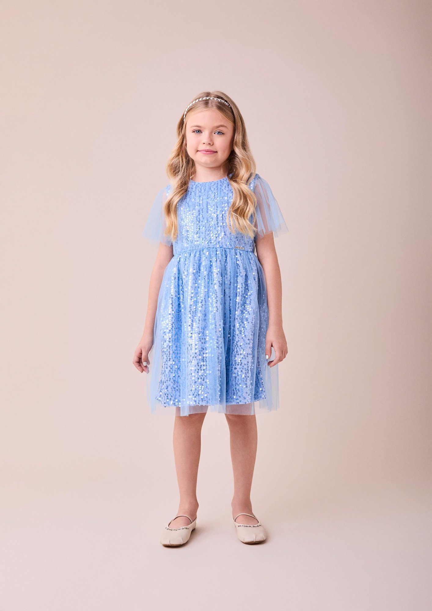 Este deslumbre-se com este vestido azul encantador que combina paetês brilhantes com delicadas mangas de tule. Perfeito para ocasiões especiais, ele proporciona um toque mágico ao look das pequenas. A saia volumosa completa o visual de princesa, ideal para momentos inesquecíveis. Ref.: H6051